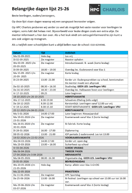 Op HPC Charlois proberen wij verder zo veel als mogelijk het vaste rooster voor leerlingen te volgen; soms lukt dat helaas niet. Bijvoorbeeld voor leuke dingen zoals een extra uitje. De mentor informeert u hier dan over. Als u het leuk vindt om extra geïnformeerd te zijn kunt u ons ook volgen op Instagram.